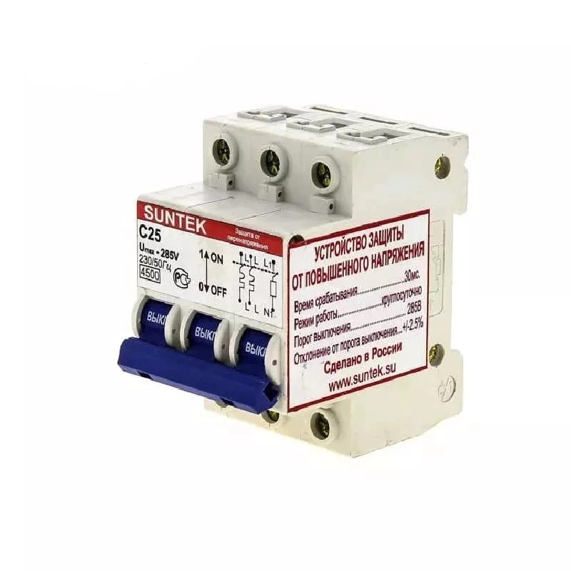 SUNTEK-C – трехмодульный автоматический выключатель с установкой на DIN-рейку. Первые два модуля выполнены как автоматические выключатели, которые срабатывают от токов короткого замыкания. В третьем модуле встроенный блок контроля и выключения. Устанавливается на вводе эл. энергии. При трехфазном питании устанавливаются на каждую фазу.
