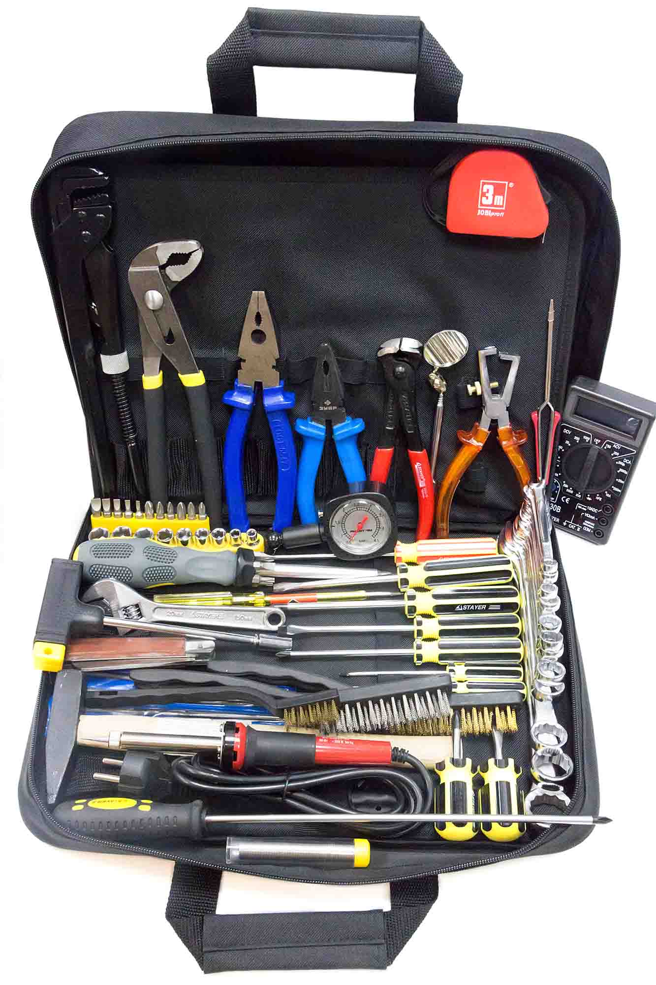 В состав набора НИ РК входят 27 предметов, в том числе молоток, отвертки, мультиметр, плоскогубцы, кусачки, электропаяльник, набор ключей, манометр.