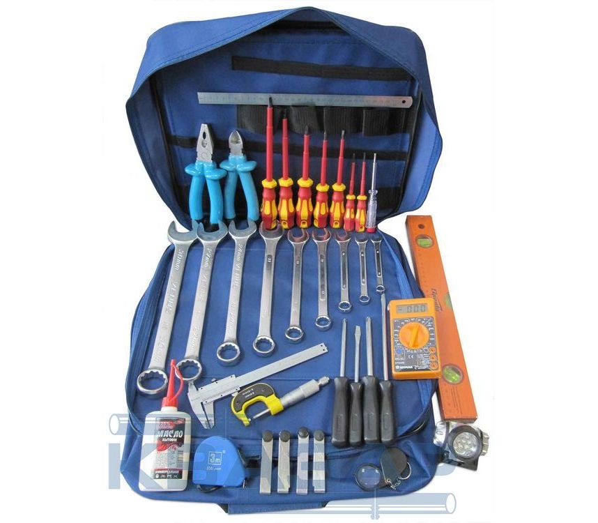 Набор включает в себя 17 видов инструмента, в том числе плоскогубцы, кусачки и набор отверток с изолированными ручками, микрометр, штангенциркуль, отвертку-спаннер, линейку, уровень, набор ключей, мультиметр, лупу, масленку, рулетку, налобный фонарь.