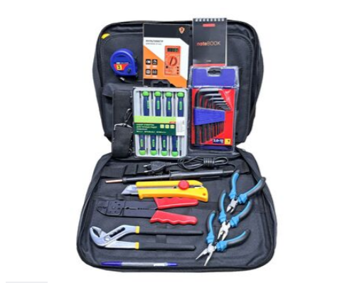 Набор НИ НО состоит из 37 предметов ключи, пассатижи, пинцет, бокорезы, паяльник, отвертки, съемник, масленка, мультиметр, телескопическое зеркало, а также многофункциональный инструмент для обжима и снятия изоляции.