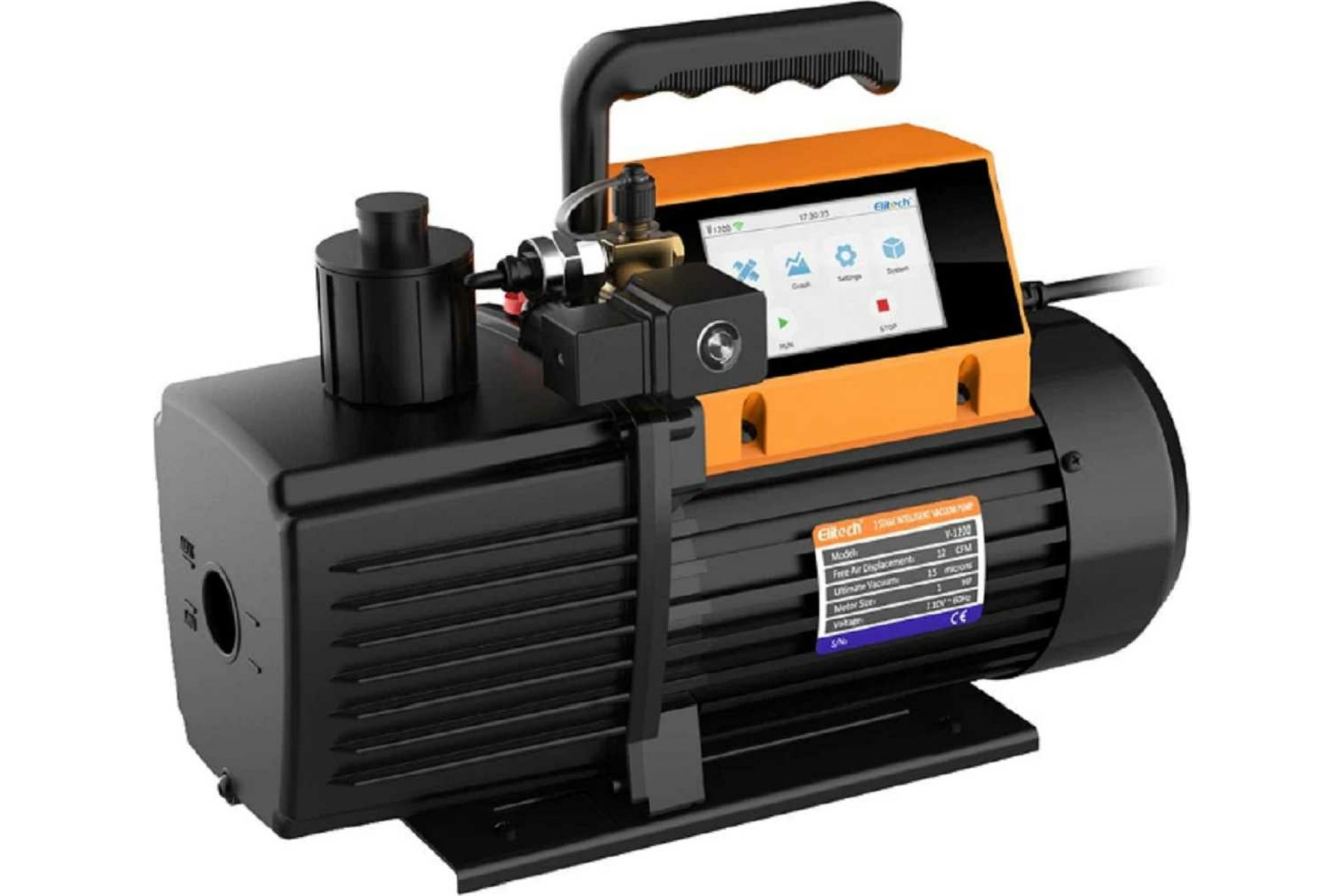 Вакуумный насос Elitech V1200 - это двухступенчатый агрегат производительностью 12 кубических футов в минуту с инновационным дизайном сенсорного экрана. На экране отображается изменение данных в виде графика, чтобы помочь узнать больше о том, как идет работа в области HVAC. Позволяет мобильному приложению подключаться к помпе для удобного дистанционного управления, настройки, чтения в реальном времени и экспорта данных.